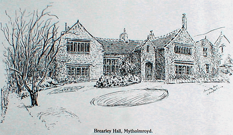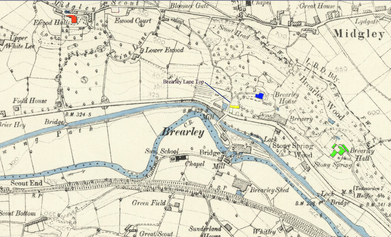 TWO HALLS Indeed, it appears that there were two halls one called Brearley Old Hall, (behind cottages near the corner of Burnley Road and Brearley Lane Top), which I will call the LOWER HALL the other Brearley Hall which I will call the UPPER HALL: "Across the road (Burnley Road, the main road through Brearley) - behind the cottages of Brearley Lane Top stands Brearley Old Hall, our UPPER HALL, a private residence. The history of this family residence is not wholly clear but it is presently the relic of a late Tudor house constructed around 1600 on the site of an earlier timber structure."2 "The house front was rebuilt about 1905."2 Brearley Old Hall is commonly confused with Brearley Hall, our UPPER HALL, further east. The interior of the 'Brearley Old Hall' [The Lower Hall].12 On the 1840 O.S. map Brearley Old Hall is in fact marked as 'Lower Brearley'. In 1841 Branwell Bronte, the brother to the Bronte sisters of Haworth lodged here at Brearley Hall.9 It is now a grade II listed building (O. S. grid ref: SEO268926083). On 1st August 1691 William Midgley was buried at Luddenden Church, residing at 'Brearley, Midgley' while five years later on 29th August 1696 another unnamed member of the Midgley family who resided at 'Brearley Hall, Midgley ' was buried at Luddenden Church. [Luddenden register]