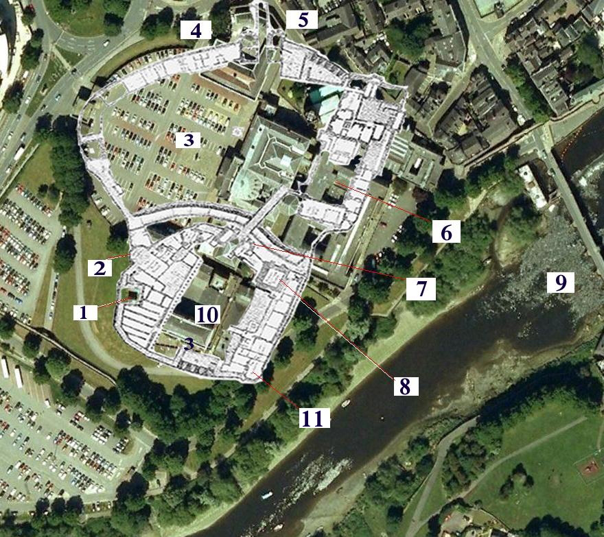 ![]() Chester Castle with map overlay Key: 1. The Flag Tower 2. Half Moon Tower 3. Outer Bailey 4. Outer Ditch 5. Castle or Outer Gateway 6. The Great Hall later the County or Shire Hall. 7. Inner Gateway 8. Julius Agricola's Tower 9. Handbridge 10. Inner Bailey formerly The Parade. 11. Justicar's Apartments. |