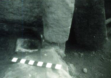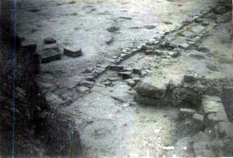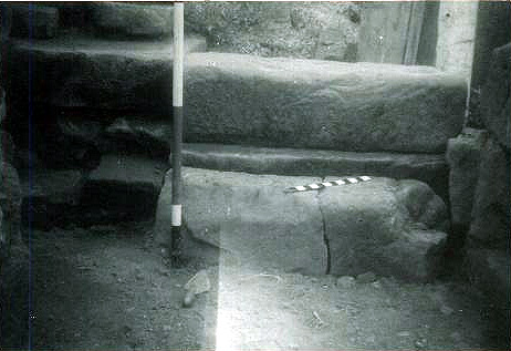 ![]() 11. Steps to the seating bank inside the main gate. The sighting staff is measured in feet, ruler in inches, trowel in foreground. |