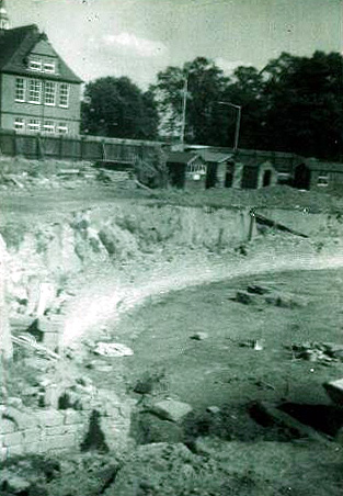 ![]() 2. Amphitheatre east wall and gate, dumper in foreground, main drain centre, utility sheds on the Roman seating area. |