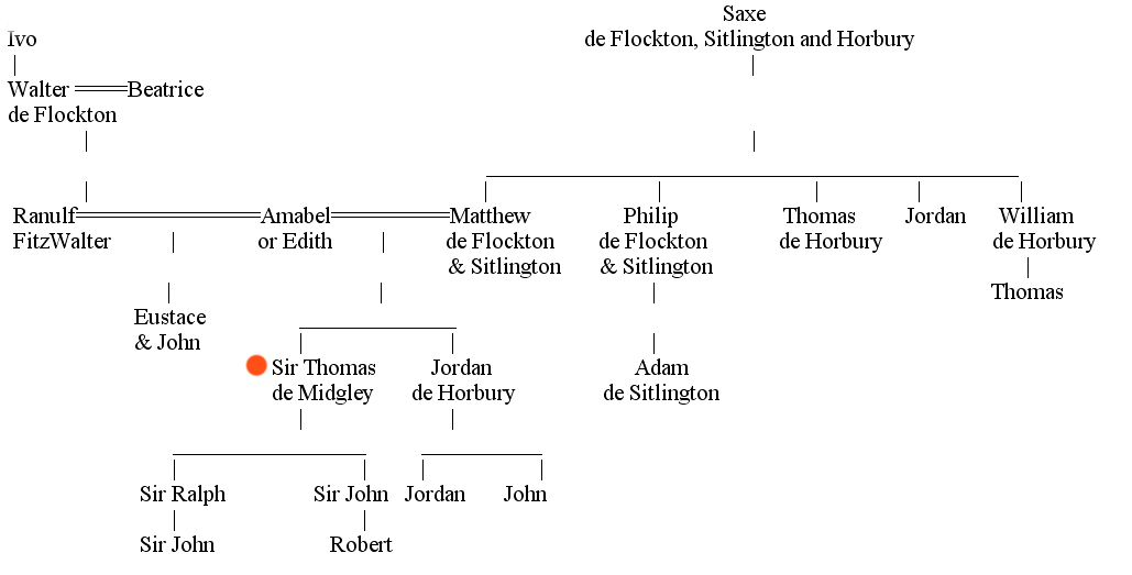 Saxe had at least five sons: 1. Matthew de Horbury [de Horbiri] of Flockton and Sitlington b.1122-1130; d. 1188-1196 aged about 66 years. 2. Philip de Sitlington of Flockton and Sitlington 3. Thomas de Horbury 4. Jordan de Horbury 5. William de Horbury 1. Matthew de Horbury Eldest son and heir of Saxe who in about 1154 married Edith [b. ~ 1133]. Edith is found mentioned in Early Yorkshire Charters, vol. III, p. 379 where she is said to be Matthew de Horbuy's wife. Some genealogists have her as Amabel, widow of Ranulph FitzWalter of Flockton. Matthew held land of the Warenne's in Sitlington, Blacker, Flockton, Horbury and Dewsbury. A charter no. 1752. shows a 'Grant by Adam, prior of Pontefract, to Matthew (son of Saxe) of his land of 'Schitlingtona', as Saxe his father held it, for 6s. yearly, reserving to the monks necessaries from the woodlands ; Edith, wife of Matthew, in case she survived him, to hold the land for life in dower by the same rent. 1155-1158.' From the Chartulary of Pontefract, formerly held at Woolley Hall, f. 75. Pd. in Chartul. of Pontefract, p. 582: Notum sit omnibus tam presentibus quam futuris quod dominus Adam, prior Pontisfracti, consensu totius capituli concessit huic Matheo terram suam de Schitlingtona in bosco et piano sicut pater ejus Saxi earn melius tenuit pro vj solidis per annum solvendis, liberam et quietam ab aliis servitiis preter ea que liberalis homo facere solet domino suo sine exactione. Ita tamen ut monachi tantum habeant de bosco quantum sufficiat propriis operibus eorum. Et si contigerit Matheum mori ante Edith uxorem suam, eodem servitio quod modo reddit Matheus teneat ipsa eandem terram sicut ei in dote donaverit earn. Hujus rei testes sunt, Adam filius Sywardi, Adam de Horbiri, Paulinus filius Wald[evi], Robertus filius Stanard, Paganus parmentarius, et alii. [Farrer, W., Early Yorkshire Charters, vol. III, 1916, p. 379.] 1753. Surrender by Matthew son of Saxe to the monks of Rievaulx of 4 acres and 1/2 perch of land in Blacker, whereon to make smithies for the manufacture of iron and utensils, with iron ore and dead wood in his part of Flockton and 'Sittlingtun' for the supply of those smithies, also common of pasture in those towns for certain animals, and licence to attach the pool of their mill to be made on the stream by Blacker. 1155-1170. From the original, formerly in possession of Sir Francis Wortley, knt. and bart.; Dodsw. MS. Ixii, f. 18; Chartul. of Rievaulx, Jul. D. i, f. 59d (old f. 63d). Pd. in Chartul. of Rievaulx, n. 101. Universis fidelibus Christi tam presentibus quam futuris Matheus filius Saxi salutem. Noverit universitas vestra me dedisse et presenti carta confirmasse Deo et ecclesie Sancte Marie Rievallensis et monachis ibidem Deo servientibus iiii. acras terre et dimidiam perticatam in loco qui vocatur Blakeker, ad faciendas ibi fabricas suas in quibus facient ferrum et utensilia et alia necessaria domui Rievallensi, et totam mineriam et totum mortuumboscum ex parte mea de Floctun et de Sittlingtun ad usus earumdem fabricarum ; ita ut nullus alius in hiis locis fabricam nisi predicti monachi habeat. Preterea concede eis communem pasturam predictarum villarum per omnia, exceptis segetibus et pratis, ad tres equos et quatuor boves et v. vaccas et xx. porcos similiter ex parte mea, et vias et semitas per totum campum et boscum, sine lesione segetis et prati. Insuper concede eis firmare stagnum suum ad molendinum faciendum in terra mea, si voluerint, super rivulum qui currit juxta Blakeker. Quod si forte alicui terram istam dedero, predictam elemosinam meam, scilicet mineriam et mortuum boscum et fabricas, in manu mea retineo ita ut nullus pro hiis servitium exigat a monachis nisi ad animam suam. Hec omnia dedi eis concessu uxoris mee et omnium heredum meorum, pro anima patris et inatris mee et pro anima mea et uxoris mee et omnium parentum meorum, in perpetuam elemosinam, libera et quieta ab omni consuetudine et servitio seculari et placitis et auxiliis et interrogatis. Hiis testibus: Adam filio Petri, Rogero fratre ejus, Adam clerico fratre Petri de Wakefeld, Paulino fratre eorumdem, Philippo filio Saxi, Adam de Birktwait, Bernardo de Silkestun, Henrico filio Dolfini, Ricardo filio Bernardi, Helia filio Jordani, Helia de Sireburne. This grant was confirmed by the grantor's son, Thomas de Horebiri. Alric and Gamel had manors in Flockton T.R.E. together assessed at 3 carucates of land. They were surveyed as part of the fee of Ilbert de Lascy. Matthew de Horbury had at least four sons: a. (Sir) Thomas de Horbury [Thomas de Horebir] of Little Midgley, eldest son and heir of Matthew. He was appointed as steward of the Warenne fee in Yorkshire as were his son Sir Ralph and grandson Sir John de Horbury. Thomas was born about 1155 at Horbury West Riding Yorkshire. He was also called Thomas de Midgley as he held Little Midgley, parish of Thornhill.