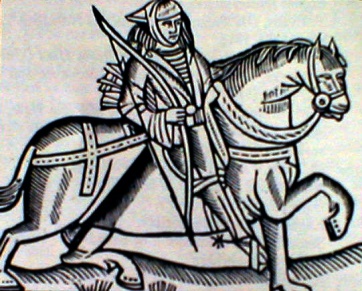 He carries a hunting horn at the waist and a sheathed sword, a quiver of