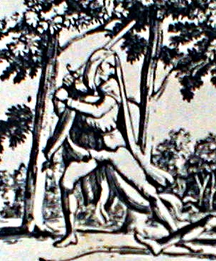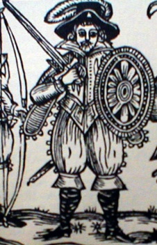About 1660 from a broadside, Robin Hood and the Shepherd: Again a flamboyant hat but no feather, a shirt with long sleeves and cuffs, pantaloons braided at the bottom, long stockings or knee-high boots with spurs. Robyn appears to be bearded. He carries arrows in his belt. [Bodleian Library, Oxford]