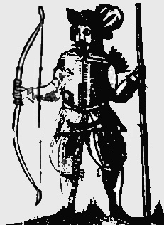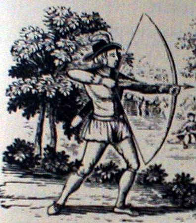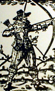 This woodcut by Richard Pynson was the first attempt to provide a visual image of the ballad hero when it was re-used in the ballad, A Lytell Gest of Robyn Hode [National Library of Scotland]. Robyn wears a cap or hat tied on with a band or ribbon. There is no feather in his cap. He has a full coat with long wide sleeves and what appear to be boots with spurs. He carries the traditional longbow and arrows, the arrows were probably tucked into his belt. [Quivers are not evident at this time] This image was probably re-used because the Gest refers to Robyn as a 'yeoman', essentially a gentleman farmer. From the frontispiece of Wynken de Worde's publication of A Lytell Geste of Robyn Hode: