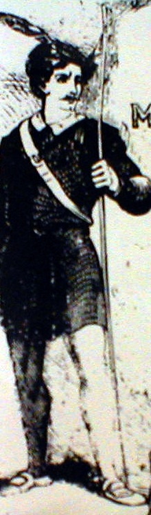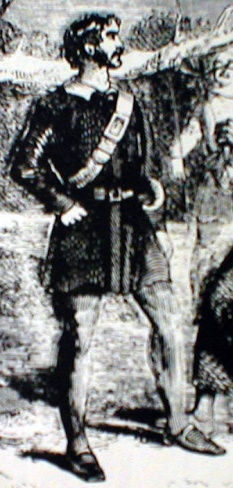 1850 Pierce Egan's title page to Robin Hood and Little John: Here the image of Robyn is becoming more like the familiar 20th century versions. A much less flamboyant hat, the feather, which seems to have made an appearance in the 1600's is still there. A collared kirtle or tunic and a sash belt, shoes, perhaps buckled. He sports a very debonair moustache.