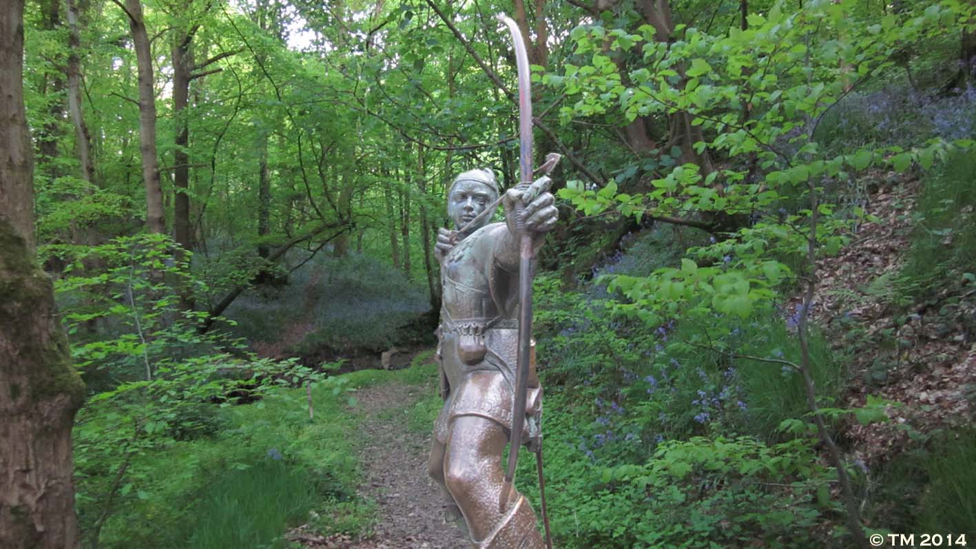 ANOTHER REASON TO PRESERVE ENGLISH FOREST AND WOODLAND Here we have the brass statue of the ballad hero at Nottingham superimposed upon a background of a brook and woodland which lie within the manor where the real Robyn was born and in all likelihood where he played as a young child. The scene was taken in July with bluebells still evident before the summer tree canopy obscured most of the daylight. Note how in this case the artist has Robyn as a right-hand bowman. |
