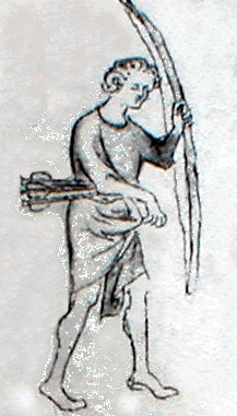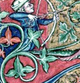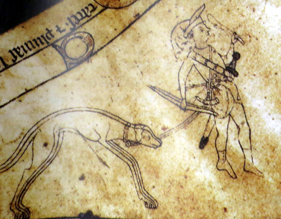 In the cathedral at Hereford is a 'curious map' which shows in the bottom right hand corner a forester leading two large hounds possibly 'gazehounds', a precursor to the greyhound. The forester is carrying a bow, a broad sword, a hunting horn, an arrow sheaved in the belt and a cudgel. He wears a tight fitting curte pie or short coat and hose, probably both of wool. The forester appears to be allowing the passage of a horseman with the words passe avant or 'go ahead' between them. Although in traditional colloquial depictions Robyn is shown wearing what is known as a Tyrolean hat, here the figure appears to have a feather and cloth bound to the head by a band. The map itself is dated to 1290- 1310 by M.B. Parkes, some hazard about 1306.