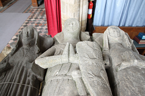 < The effigy of Sir Adam de Everingham [d.1341] with his first wife Clarice de la Warre on his left and the wooden effigy of Margery de Ledes on his right.