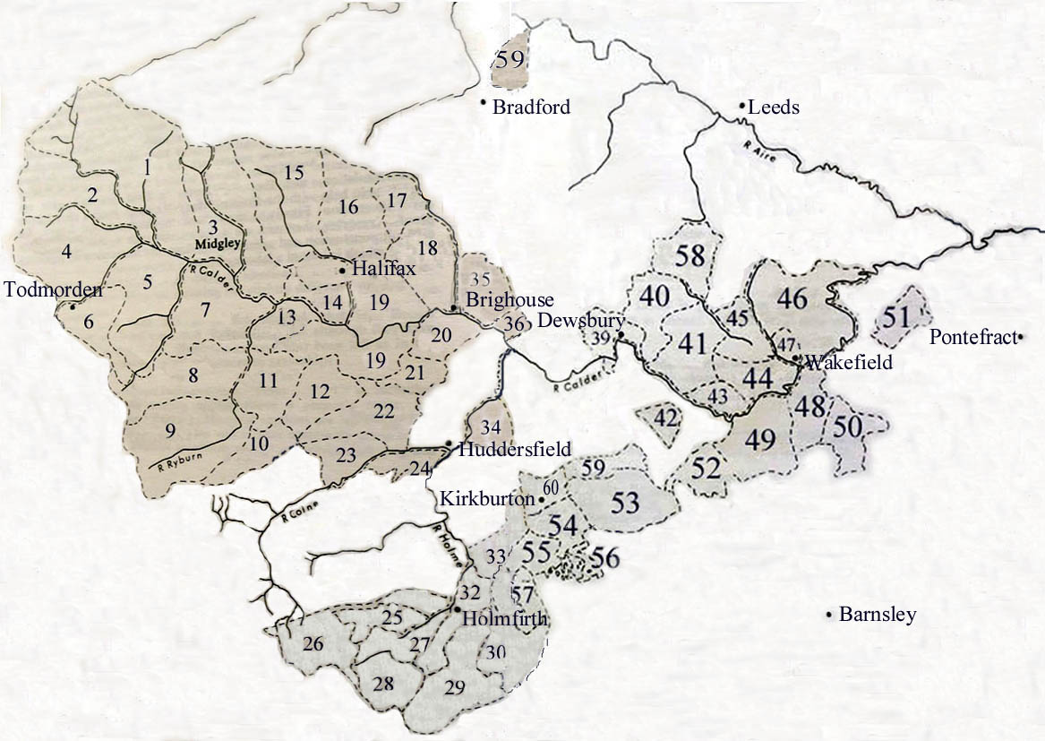 10. Collectanea, p. 73. 11. C.P.R., 1321-1324, p. 58. 12. A Concise History of the Parish of Halifax. p. 435. 13. Baildon. W.P. Baildon and the Baildons, v. 2, 1924, p.18. 14. Ibid. p. 22. 15. Ibid. pp 28, 32. i.e. A "claim in 1526-7 was put in evidence, when a verdict was given for Henry Saville, the then defendant. He had produced old Court Rolls to prove his title, and also "shewed an ancient deed under seal, without date [of 1169] , declaring that Hamelyn, Earl Warren, owner of the lordship of Wakefield, had granted to Jordan son of Askolf, ancestor to the defendant, his inheritance in Sowerbyshire." [Ovenden, Skircoat, Rishworth, Norland, Barkisland etc.] "The only difficulty here is that earl Hamelyn speaks of "confirming his [Jordan's] inheritance.......... A possible explanation would be that the Sowerbyshire estates came to Jordan's wife, somewhat late and unexpectedly, on the death of her brother or other male heir of her father; the confirmation by the Earl might then have been a re-grant on a surrender, with a life estate to Jordan himself and the remainder to the heirs of his body." [Additionally we know later inb1274 that a John de Miggeley who resided at Havershelf near Sowerby was recorded as the forester of the forest of Sowerby [Wakefield Court Rolls.1274-1297] and a Henry de Miggeley son of Addam is mentioned in 1276 as having leased land in Ovenden from Sir John de Soothill. 16. Holmes, Richard. The Chartulary of St. John of Pontefract vol II, Y.A.S. Record Series, vol. xxx, 1901, p. 426: CCCXXIII. Carta Ade filii Petri de Migelaya. [Charter of Adam son of Peter de Midgley a.k.a. Adam FitzPeter, i.e. the son of Peter de Birkin a. k. a. Peter FitzEssulf] [ .... I, Adam fitz Peter, have confirmed .... a bovate of land in Midgley, that is to say the eighth part of all Midgley, ... for the healing of my soul, ....and for the souls of all who have sinned through my occasion, Robert, my son, witnessing and granting. Witnesses.] Omnibus fidelibus sancte ecclesie filiis Adam filius Petri salutem. Sciatis me dedisse et concessisse et hac presenti mea carta confirmasse deo et sancto Johanni et monachis deo servientibus in Pontefracto imam bovatam terre in Migelaia, [This manor is "Little Midgley" in Shitlington, not Midgley near Halifax.] scilicet octavam partem totius Migelie, [sic] in bosco et piano, in paschuis et pratis, in viis et semitis, in molendinis, et cum omnibus pertinentiis suis, in puram et perpetuam elemosinam, liberam et quietam ab omni servitio et seculari exactione de me et de heredibus meis, pro remedio anime mee et patris mei et matris mee et uxoris mee Matildis et omnium antecessorum et heredum meorum et pro animabus omnium qui [See No. 320. There is a similar clause in a charter R 345 of this same Adam to Rievaux, "qui propter me vel per me peccaverunt.] causa mei peccaverint. Testante et concedente, Roberto filio meo, et testibus hiis, Thoma filio Petri [of Leeds, Adam's brother] Willelmo Campiun, Rainero Flamingo [Reyner le Fleming], Petro filio Ade [Peter son of Adam], Huctredo de Birkewait, Roberto de Stivetuna, Johanne de Rorestona, Ricardo filio Laising [Richard son of Leising], Rogero fratre suo, et aliis. It is interesting here to see that Jordan's brother Peter is referred to as Petri de Migelaya [Peter de Midgley] indicating a probable genetic link between the early 'Thornhills', sons and grandsons of Essulf, and the early Midgleys. 17. V.C.H. Lancashire v. 3, 1907. p. 46. 18. Calendar of Close Rolls, Henry III: volume 4: 1237-1242 (1911), October 1238, p. 113. 19. Cal. Chart. Rolls. 1300-1326, p. 334. 20. Chartulary of Cockersand Abbey. vol II, Chetham Soc. 1900. pp. 564-565. 21. Hunter, J. South Yorkshire. The History and Topography of the Deanery of Doncaster. Vol II, 1828/1831, p. 242. 22. C.P.R., 22nd March 1326, p. 251. 23. Pedigree Chart from The Chartulary of St. John Pontefract, vol 1, 1907, p. 254. The manor of Sitlington had four hamlets / sub-manors: